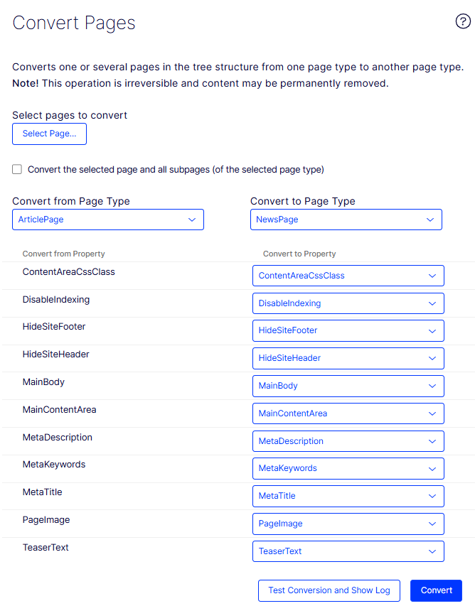 Convert pages and subpages to different page types in Optimizely CMS 13. Map properties, manage child pages, and test conversions before applying changes.