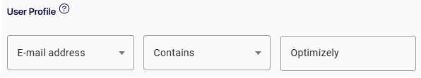 User Profile – Match one of the user profile properties with a specified value, such as E-Mail address contains Optimizely. You can select Comment, Username, E-mail address, or Phone number. Then select Equals, Contains, Starts with, or Ends with. Then enter your criterion.