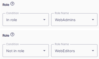 Role – Matches the visitor's access role when visiting the website. You can include roles using the In Role condition and exclude roles using the Not in role condition.