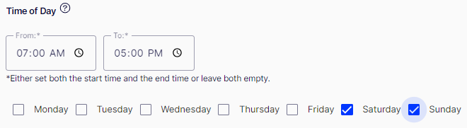 Time of Day – Matches the set time period. For example. Saturday and Sunday between 7 a.m. and 5 p.m.