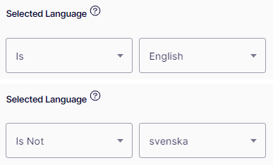 Selected Language – Checks which language the visitor is viewing a page in when using fallbacks. For example, check if the visitor views a page in English by selecting the In condition or not in the Svenska language by selecting the Is Not condition. Languages which are defined and enabled are available in the list.