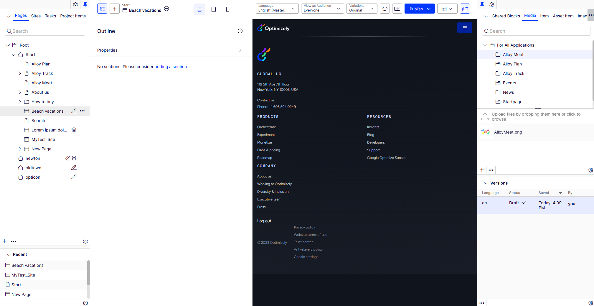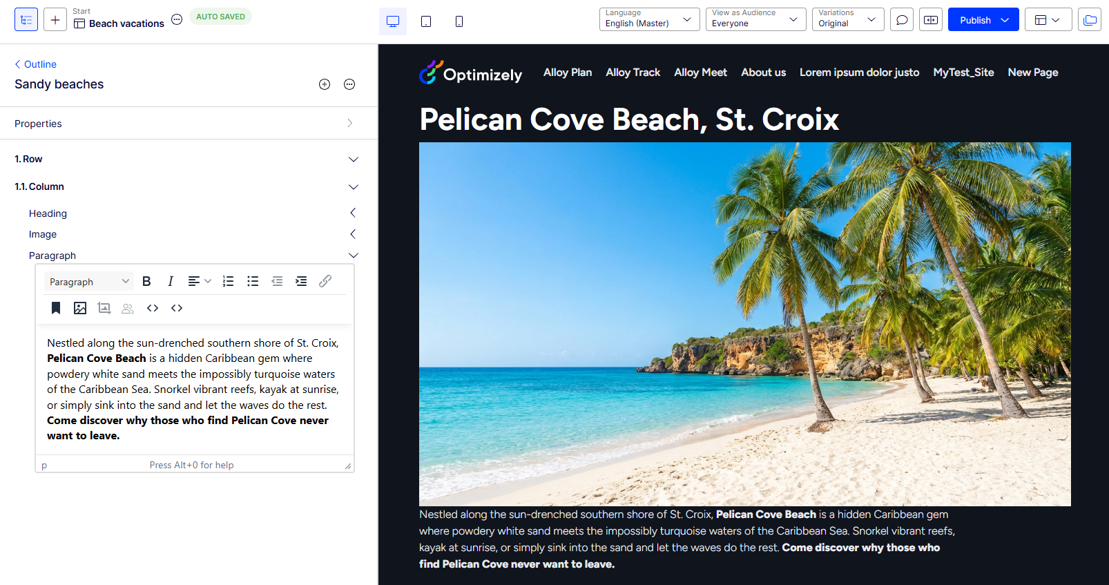 Create Optimizely Visual Builder content from scratch. Follow step-by-step instructions to build pages, sections, rows, columns, and add elements.