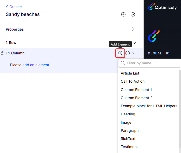 Click Add Element and select the element you want in row 1, column 1. See Elements in Visual Builder.