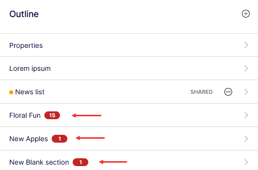 The total number of validation errors displays next to each section that has required fields that you have not completed. You can go to the outline within a section to view the breakdown of validation errors on each row, column, and element within that section.