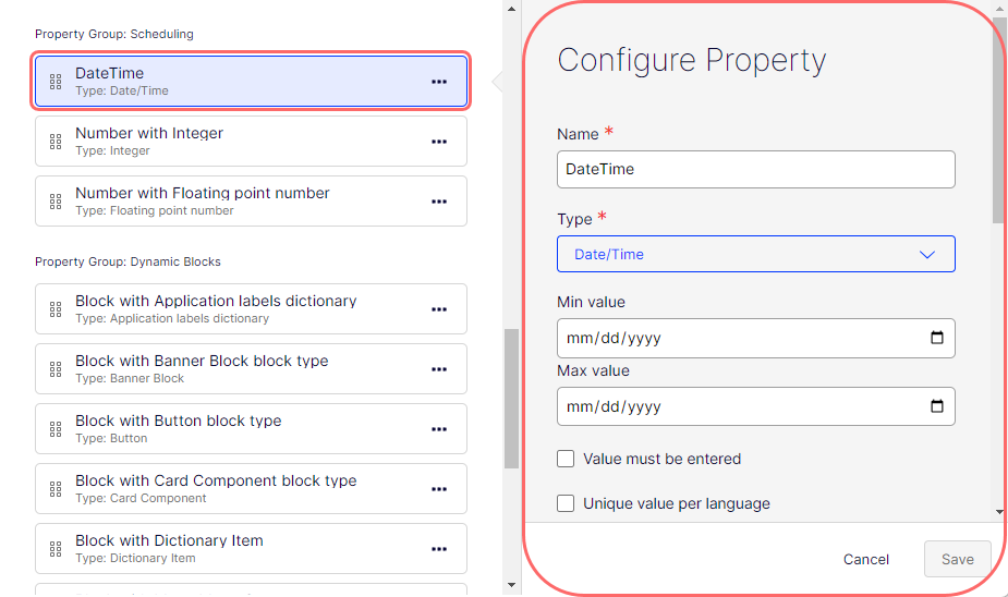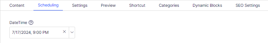 Property Group – Select a property group (Categories, Content, Dynamic Blocks, Preview, Scheduling, SEO Settings, Shortcut) to organize your content on tabs in the All Properties edit view of the content type. The following image shows the DateTime field on the Scheduling tab (property group).