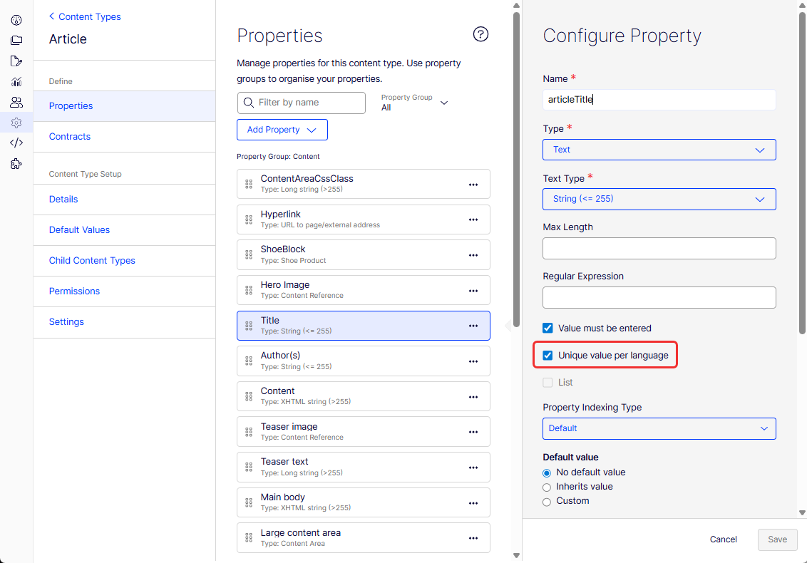 By setting the Unique value per language property, Optimizely Content Management System (CMS) 13 knows to retrieve and display the correct language-specific value depending on one of the following factors: