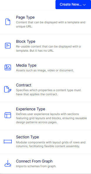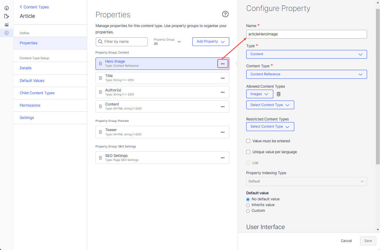 You can create different content types (Page, Block, Media, Experience, Element) by defining combinations of properties. To work with content types, go to Settings > Content Types > [select content type] > Properties.
