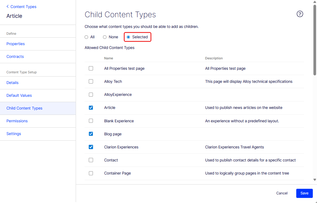 You can limit the content types that others can add as associated children of the content type. None is the default (for no child types), but you can select All (any child type), or Selected and select the ones you want as shown in the following image. For example, perhaps you want the Article content type's children types to be limited to Corporate Office and Article Group Page.