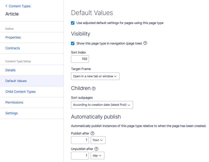 NoteThe Default values page appears only for page types; not for block, media, experience, or element types.