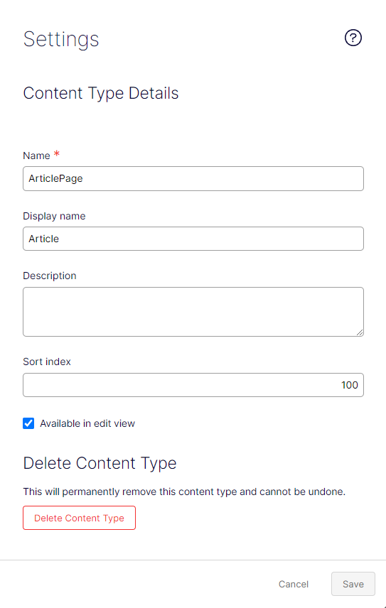 Available in edit view – Enable this when you want to make the content type available in edit view. Clear it to make it inaccessible from edit view.