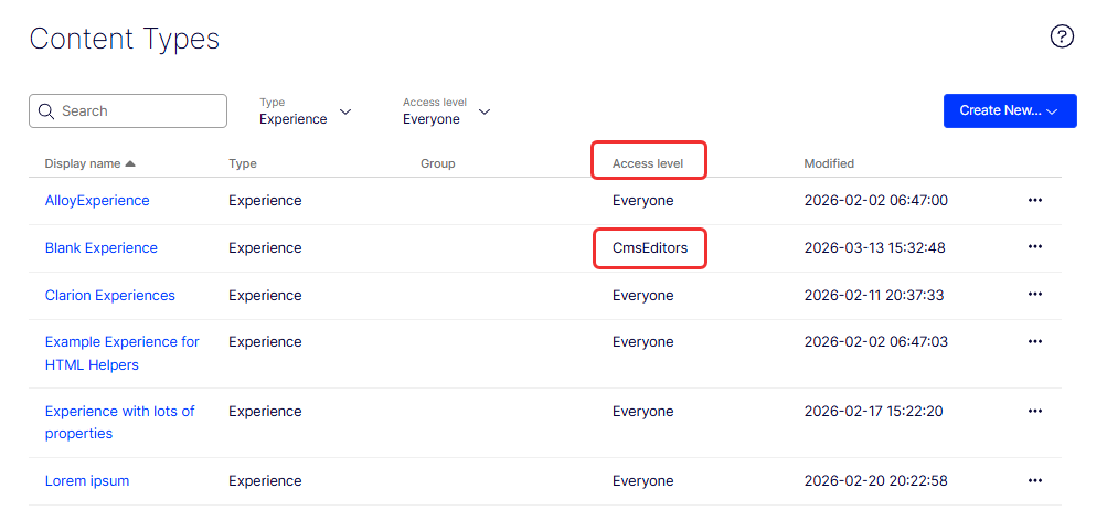 Click Save. The updated content type shows CmsEditors in the Access Level column of the Content Types list.