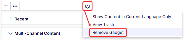 When you add the Multi-Channel Content gadget, you can remove and re-add the Navigation and Assets gadgets through the Add Gadgets settings option. To remove a gadget, open the gadget's settings and select Remove Gadget.