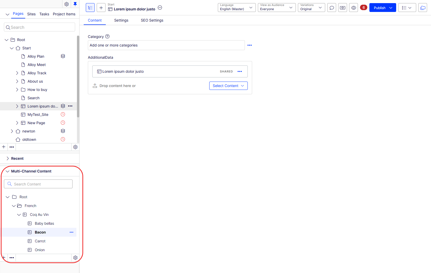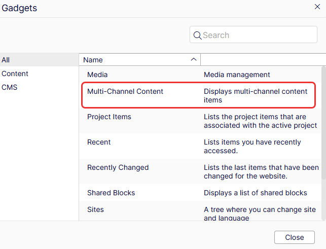 The Multi-Channel Content view is similar in appearance and functionality (with a search box and content tree) to the Navigation view (Pages, Sites, Tasks, Project Items) and the Assets view (Blocks, Media), with a few multi-channel content-specific differences: