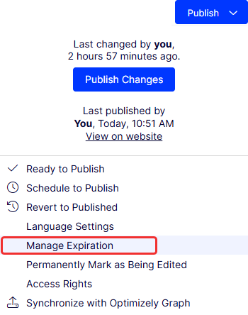 NoteThe expiration sets a stop publish date on the content and this date applies to all versions of the content. For example, if you set a page to expired and then create a draft from the latest published version and publishes that draft, it will still be expired and not displayed on the website. You must manually remove the expiration for the page to be public.