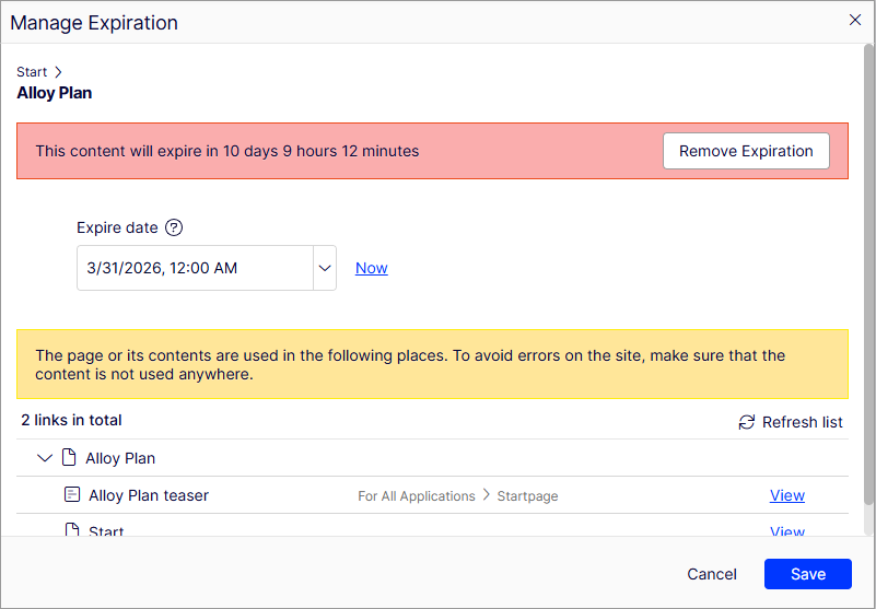- The Manage Expiration window displays other content items that link to the page you want to expire. Click View to open the page and address the link reference, otherwise the link will break when you expire the page.