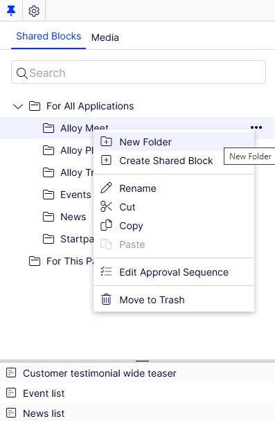 Media and blocks share the same folder structure. This means that if you create a folder under Media, the same folder is also created under Shared Blocks.
