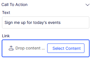 If you create a Call To Action element, click Select Content to use content from the content tree, but you can also drag content from the Assets pane (Shared Blocks and Media).