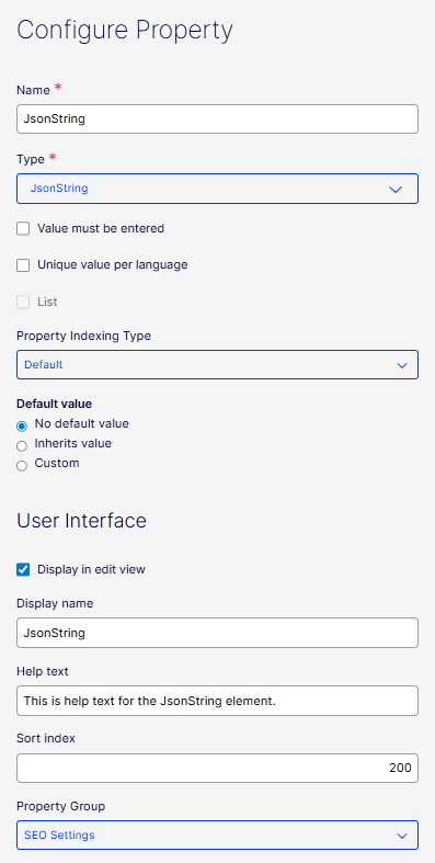 Display in edit view – Select to display this JsonString element on your page. Clear it to hide the JsonString element while keeping all the property information.