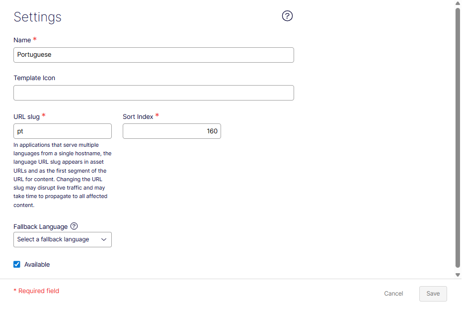 - URL slug – Provide a specific prefix to show the content of the relevant language. If you do not provide a prefix, the language code is used, such as