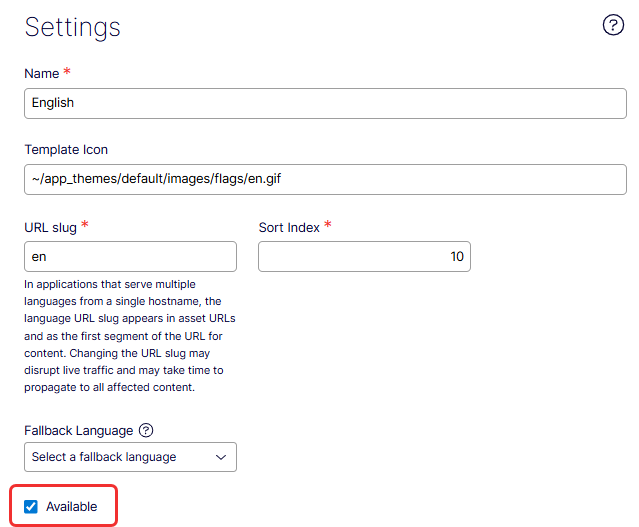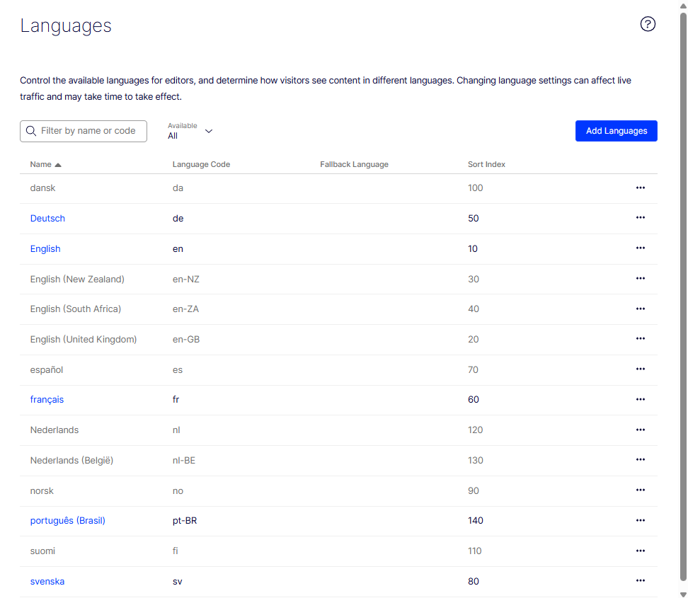 - Available – Select if you want to turn on the language to be active for editing in edit view. This option also affects whether the language is available to website visitors. A disabled language is not visible in the edit view. Existing content in that language is still accessible but cannot be edited.
