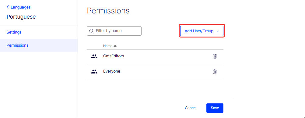 Add User/Group – Select to define which editor groups have access to create and edit content in this language (see below). When you add a language, it is available for the Everyone group by default.