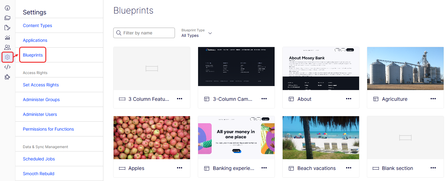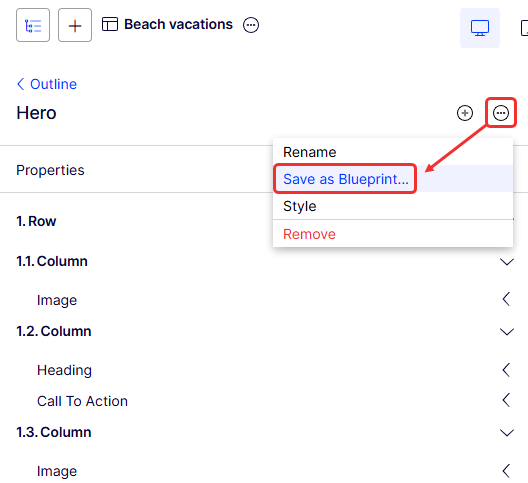 Blueprints are reusable layout templates that you use with Visual Builder to create content directly in the user interface (UI). You can save sections and experiences as blueprints, such as a campaign landing page, a contest entry form, a masthead or hero image, and column or grid content.