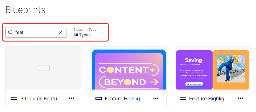 Typing the (partial) name of a blueprint in the search field filters the list of blueprints to help you find the one you want. You can also use the Blueprint Type drop-down list to filter blueprints.