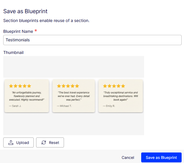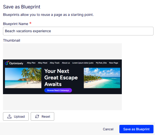 Visual Builder automatically generates a thumbnail image for the blueprint, but you can click Upload to change it with another image. You can also click Reset to revert to the original thumbnail image.
