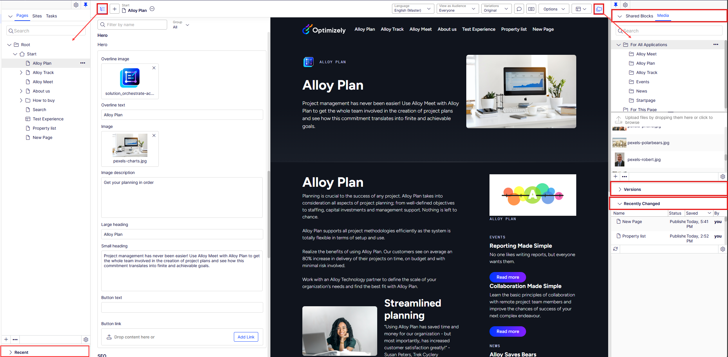 To extend the editorial interface, you can plug gadgets into the navigation panel (left) and assets panel (right) with information related to the content. These gadgets can have a tab on the tab toolbar.