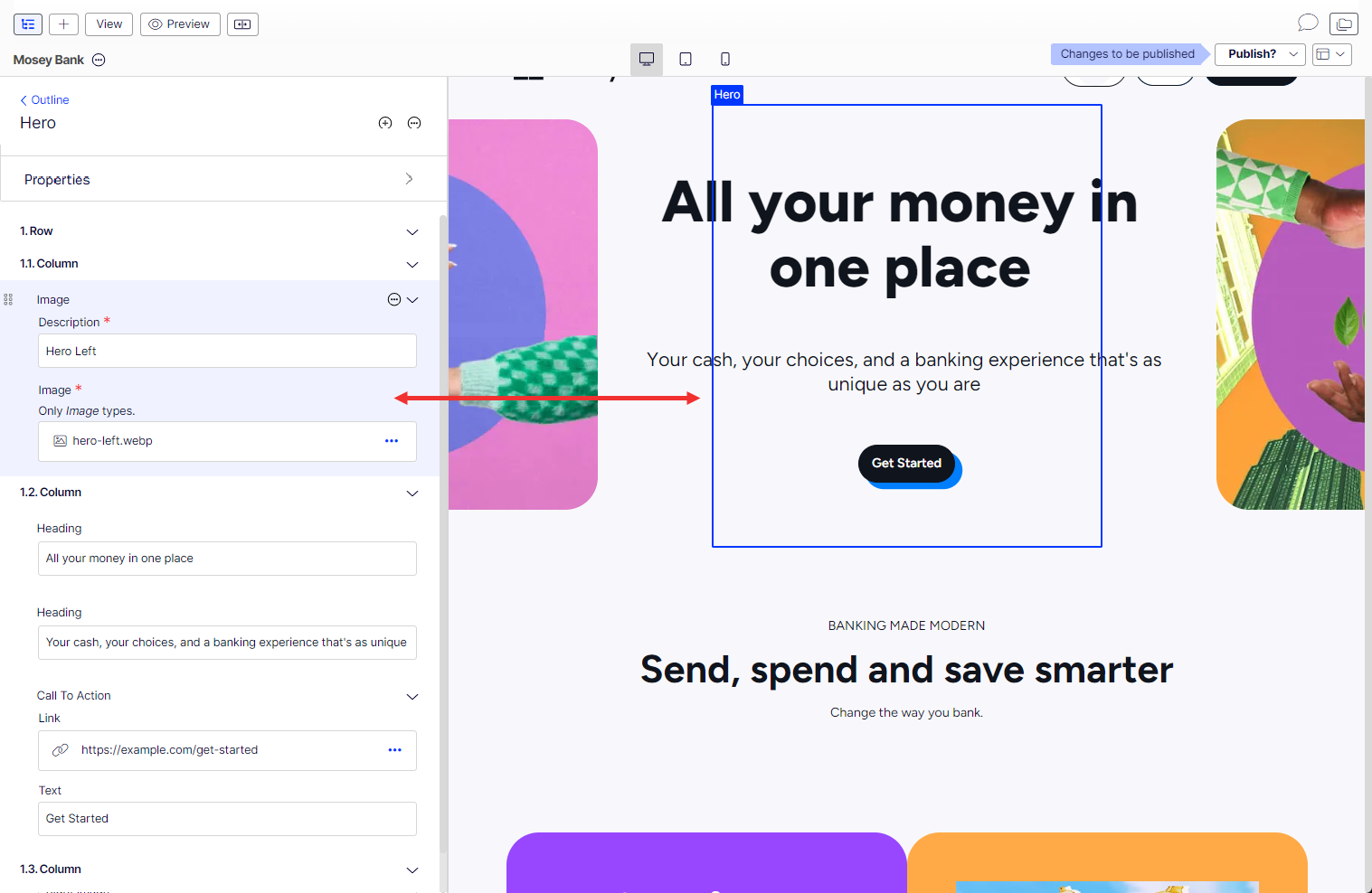 Preview Optimizely Visual Builder content across desktop, tablet, and mobile views. Adjust panel sizes and interact with the outline and preview panels.