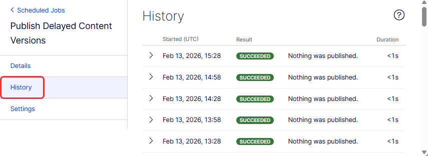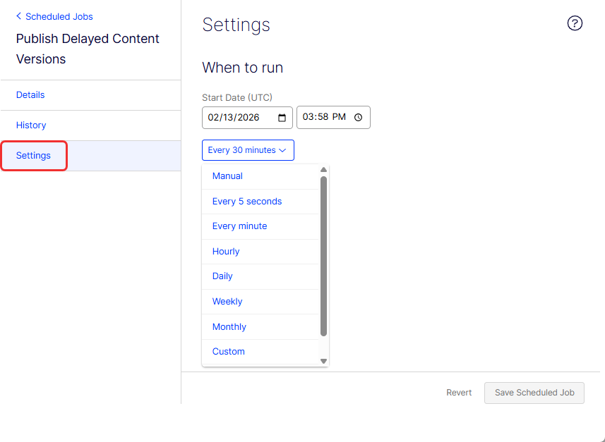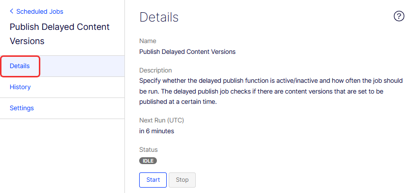 Publish Delayed Content Versions – Sets how often the system checks for content versions with a specific future publication date and time. The job is enabled by default and set to run hourly.