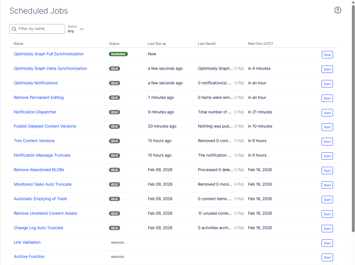 Administer scheduled jobs in Optimizely CMS. Start, stop, and configure built-in or custom jobs for tasks like archiving, trash emptying, and link validation.