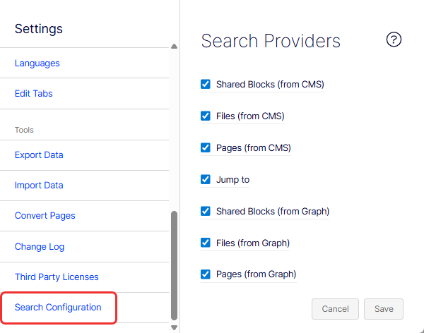 Go to Settings > Tools > Search Configuration to set the search providers for your site. This configuration allows you to change the type of results the CMS global search bar returns.