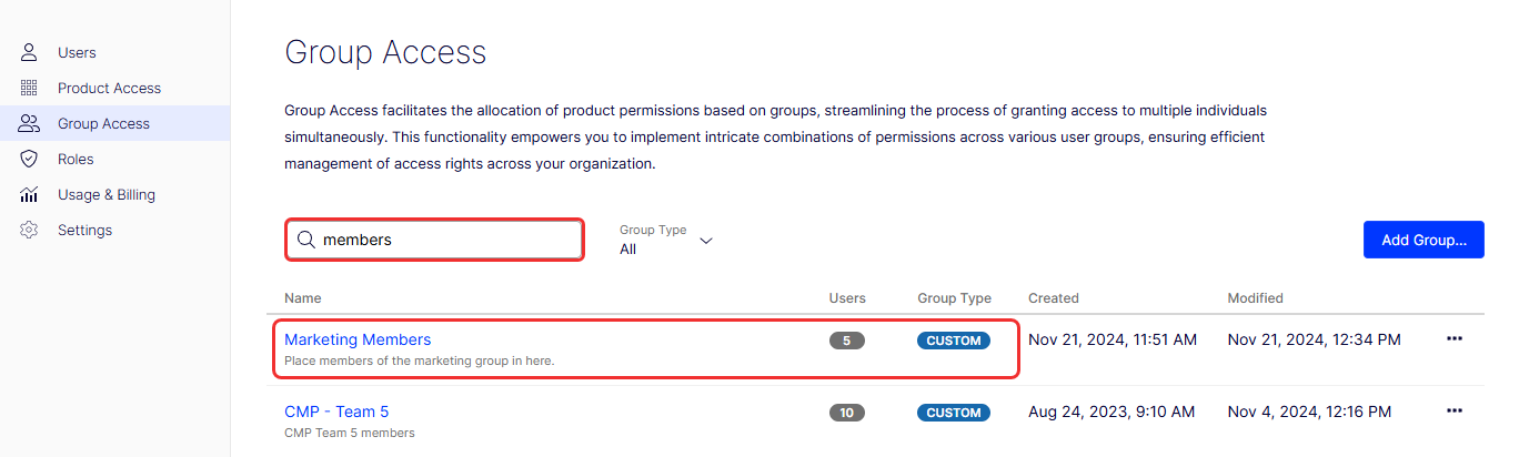 Click Save. The group displays in the Group Access list. The following image shows a filtered Group Access list and five users in the custom group.