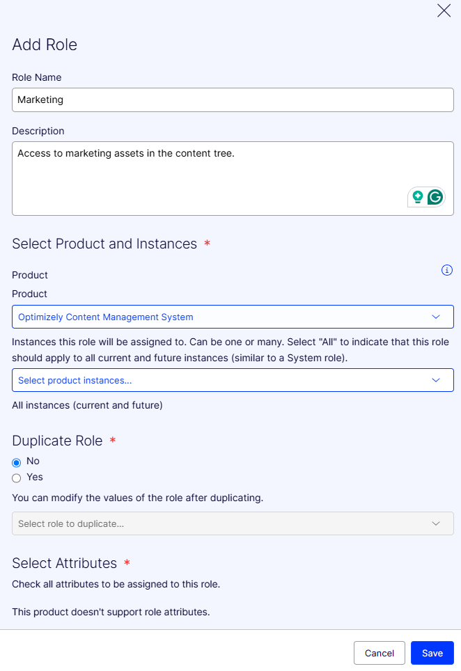 Product Instances – Select one or more instances. The role is only available for use in the CMS instances you select here. For example, to make this role available across all of your CMS instances, select All instances.