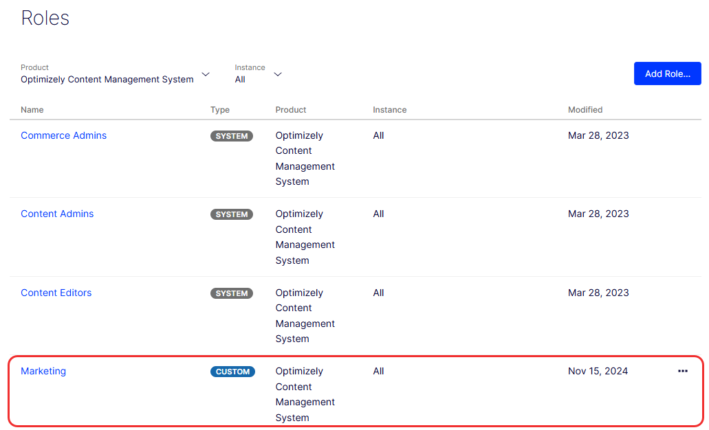Click Save. The role displays in the Roles list. The following image shows the Roles list filtered by product (Optimizely Content Management System). You can edit an existing role by clicking More (...) > View Custom Role or clicking the role name, then Edit.