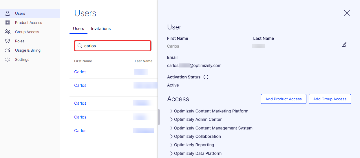 Go to Users in the Opti ID Admin Center. Search for the user and click their user name. The User panel displays information about the user.