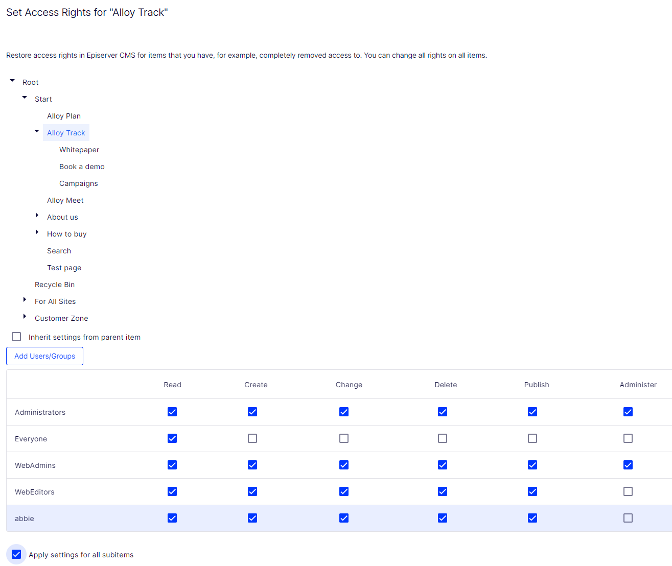 Content inherits access rights from its closest parent item by default. When you set access rights for a content item, the rights apply to it, and subitems that have a selected Inherit settings from parent item option, subitems with this option cleared are not affected. For example, Alloy Plan, Alloy Track, and Alloy Meet have the same access rights because they inherit the access rights from the Start page.