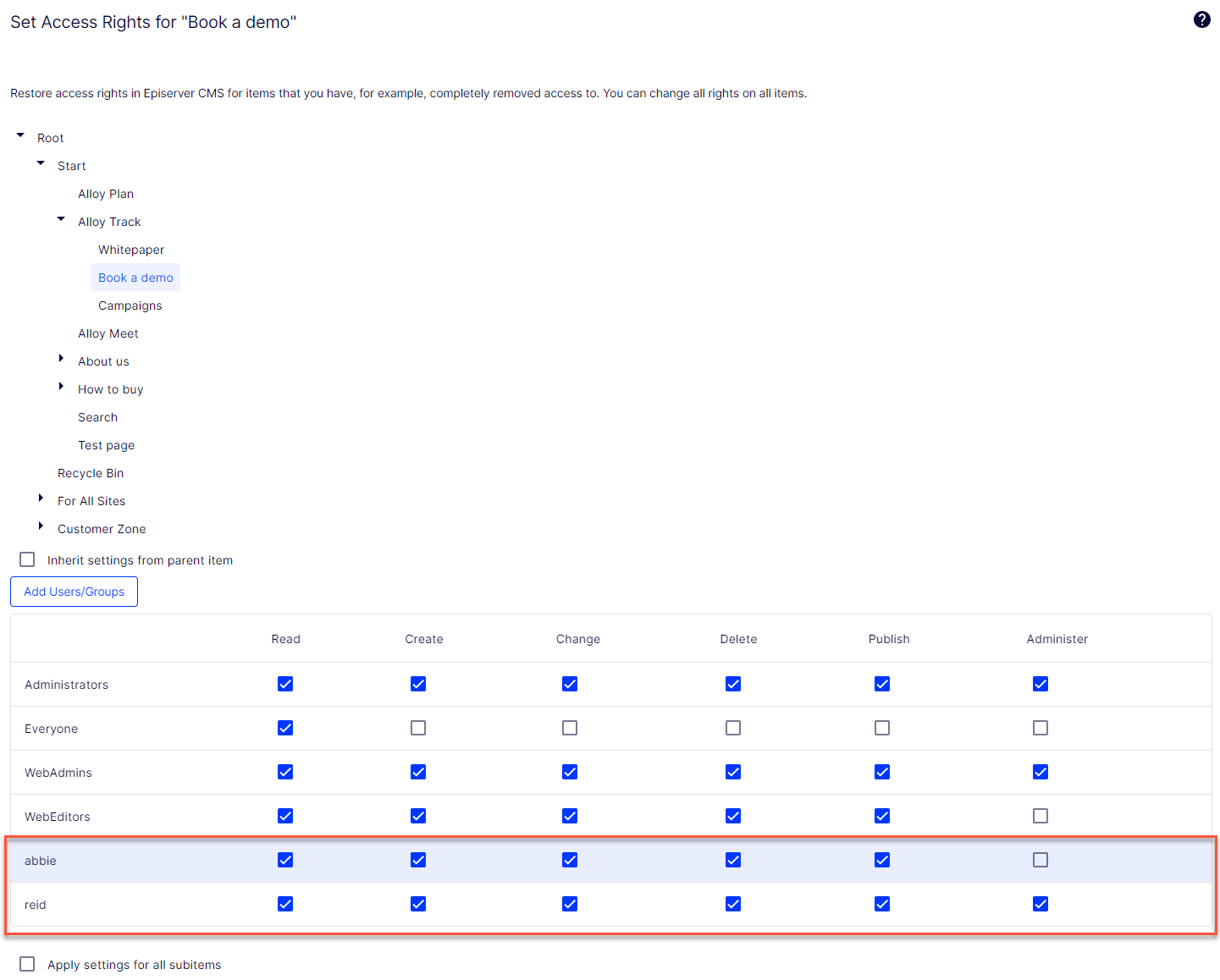 When you select Apply settings for all subitems, Abbie is added as a user with access rights to Book a demo because Abbie is part of the Alloy Track content item's access rights. Reid, who already had access rights to Book a demo, remains unchanged on the list of access rights.