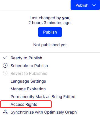 Administrators generally manage website access rights from Settings. However, you can set access rights for a single page or a block from the Publish or Options menu if you have administrator rights, which is useful when you need to publish an item to verify the final result. Still, you do not want it to be publicly visible.