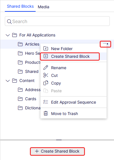 Select the folder where you want to create a shared block, and select More (...) > Create Shared Block in the context menu, or click a Create Shared Block button.