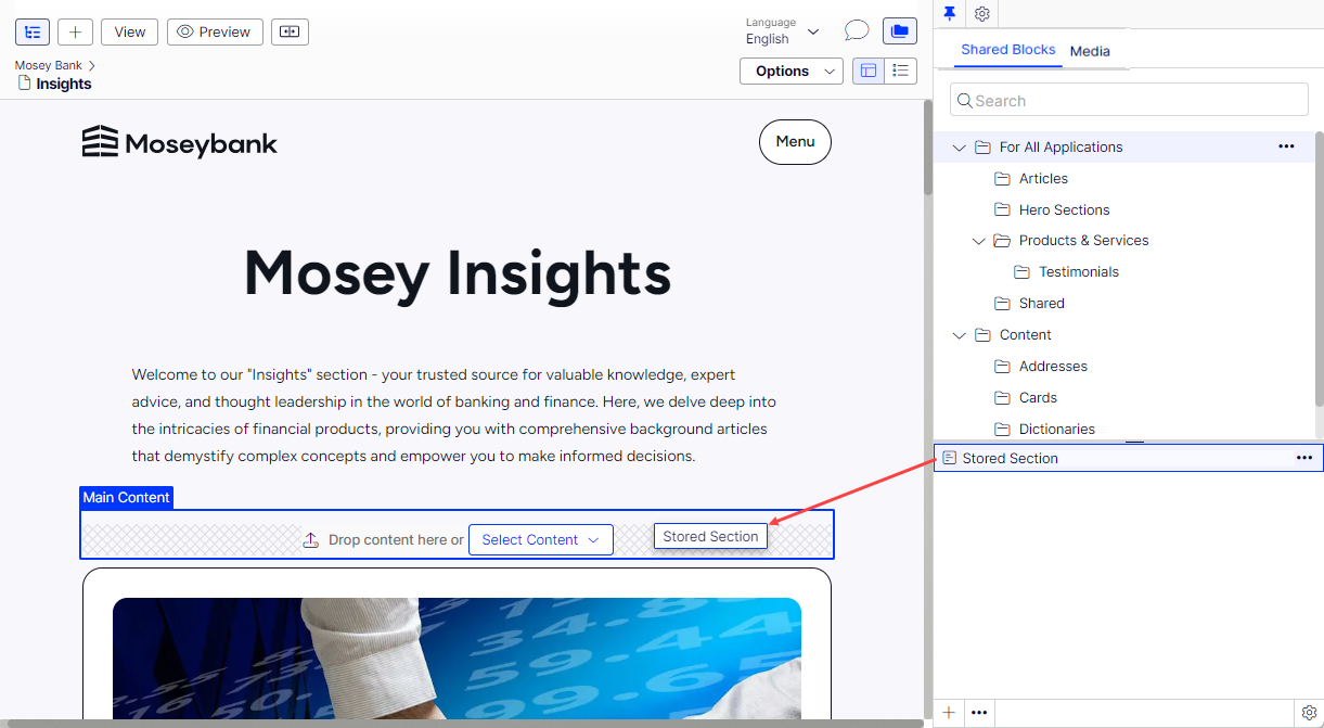 Create and organize blocks in folders from the Shared Blocks tab in the assets pane. You can then use shared blocks by dragging them into the content area of CMS pages.