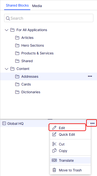 Select the shared block to edit. Select Quick Edit from the context menu to open the block in Quick edit view or Edit to open it in On-Page Editing or All Properties view.