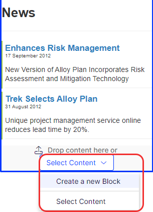 - Select Select Content > Create a new Block in the content area from the On-Page Editing or the All Properties view.