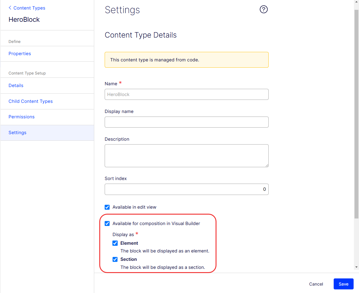 In Settings, you can configure inline blocks for use as sections and elements. An inline block can serve as both a section and an element. See also Block as an element and Block as a section in Content types in the UI.