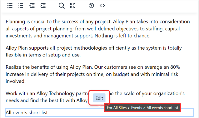 If you have an already-inserted shared block in the rich-text editor and want to find out where it is stored, select the shared block in the editor to display a Go to shared block button. Click Edit to open the shared block or hover over it to see where it is stored.