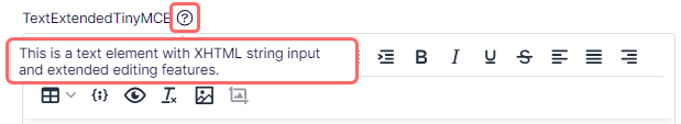 XHTML string (>255) – Select for formatted text and related content that usually comes with a WYSIWYG (What You See Is What You Get) editor (see TinyMCE Toolbar options), letting content editors manipulate the text and other elements. It has built-in validation to ensure the stored XHTML is well-formed. XHTML string suppports Minimal, Standard, and Extended configurations (below).