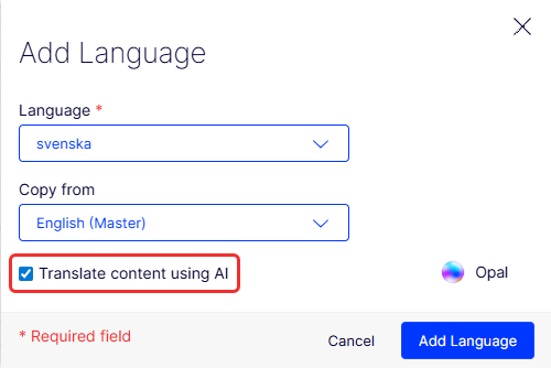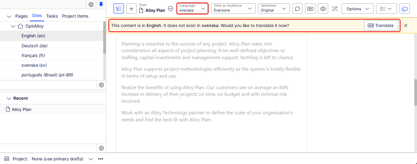 Optimizely notes that the content is in English and does not exist in svenska. Click Translate. The add language window displays.