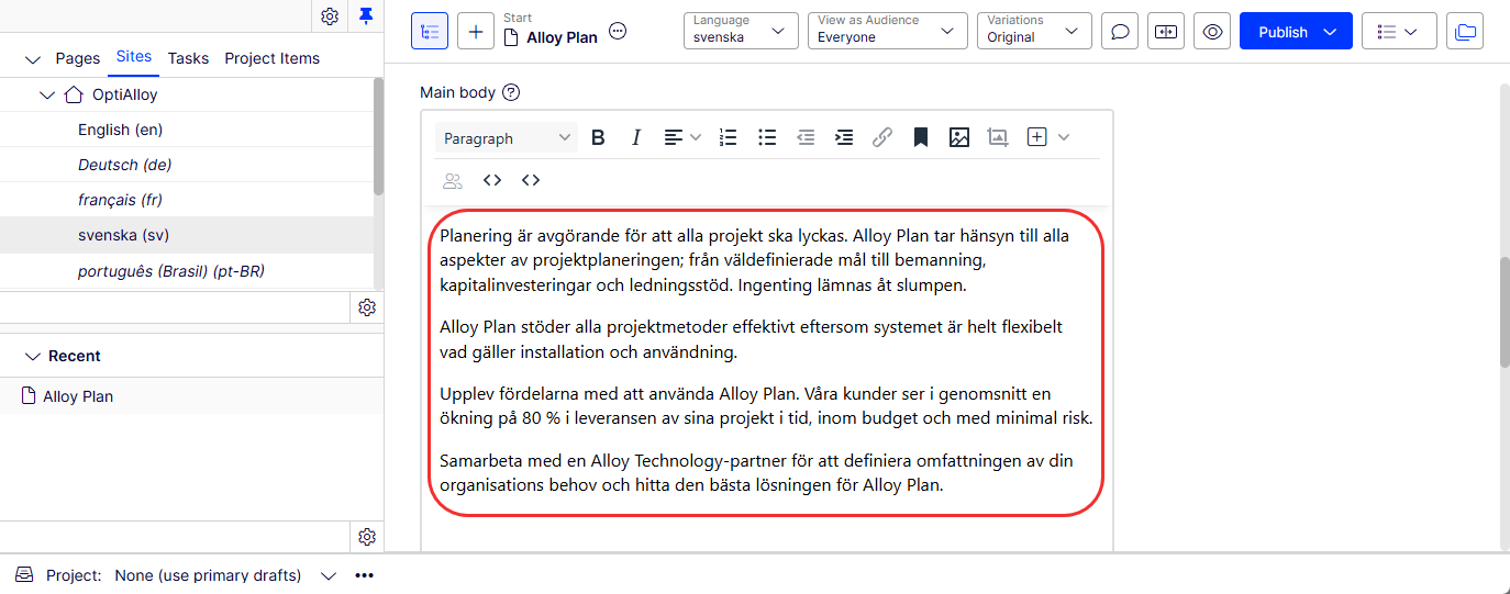 Under the Sites tab in the navigation panel, select the desired target language for translation, such as svenska.