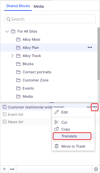Select the desired block to translate in the block structure and then the Translate option in the context menu.